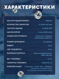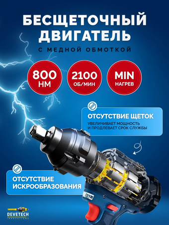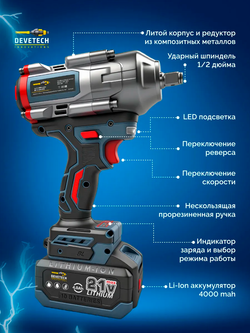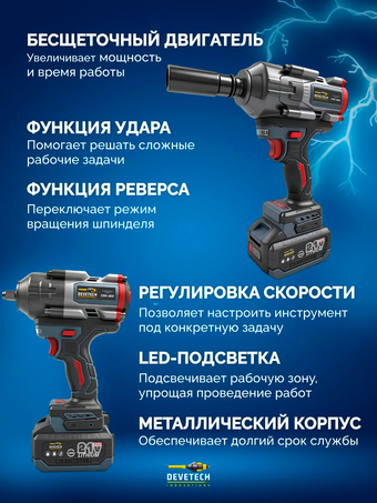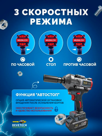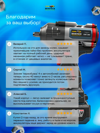 Гигант инструментов уверенно поможет вам справиться с любыми бытовыми или автомобильными задачами. Он поражает своей мощностью в 800 Нм и эффективностью - это профессиональный бесщеточный ударный гайковерт DEVETECH CIW-800 nm. Среди обширного арсенала строительных и автомобильных инструментов этот - убедительно выделяется своими потрясающими характеристиками.