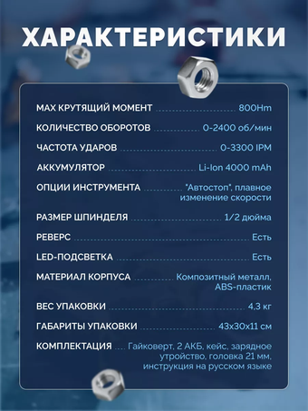Не забывайте о том, что аккумуляторный гайковёрт - это свобода движения и независимость от электричества. Вам больше не нужно переживать о проводе, достаточно только заряжать один из двух аккумуляторов и приступать к действию. Так же он может заменить шуруповерт для мощного воздействия на крепеж.